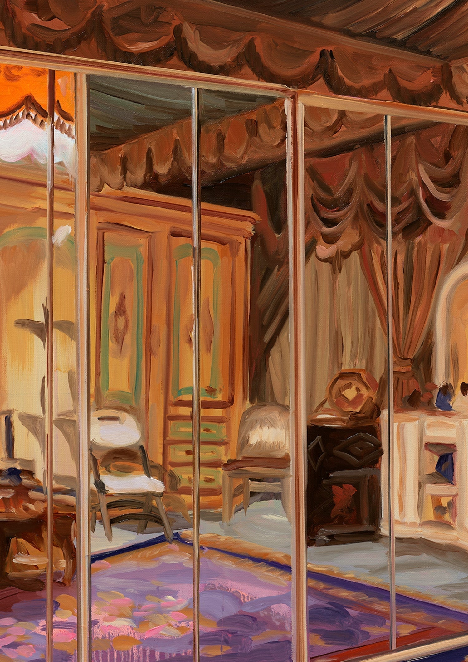 Reflective echoes are frequently coded within mirrors, with all their associations of vanity, wisdom and self-knowledge. In Study for Vanity of vanities and Study for Cast room (both 2024) for instance, the artist uses physically imposing examples to dissect the reality of what she is seeing, before reassembling it. These images feature a notable flattening of perspective that is not only informed by these oversized, fun-house reflections, but the reams of photographs the artist captures as vital source material. The adroit interplay of light and darkness, too, is channelled through various reflective surfaces, such as the polished top of a hardwood dressing table, or the diffractions that occur when the sun hits a glass vase filled with water.