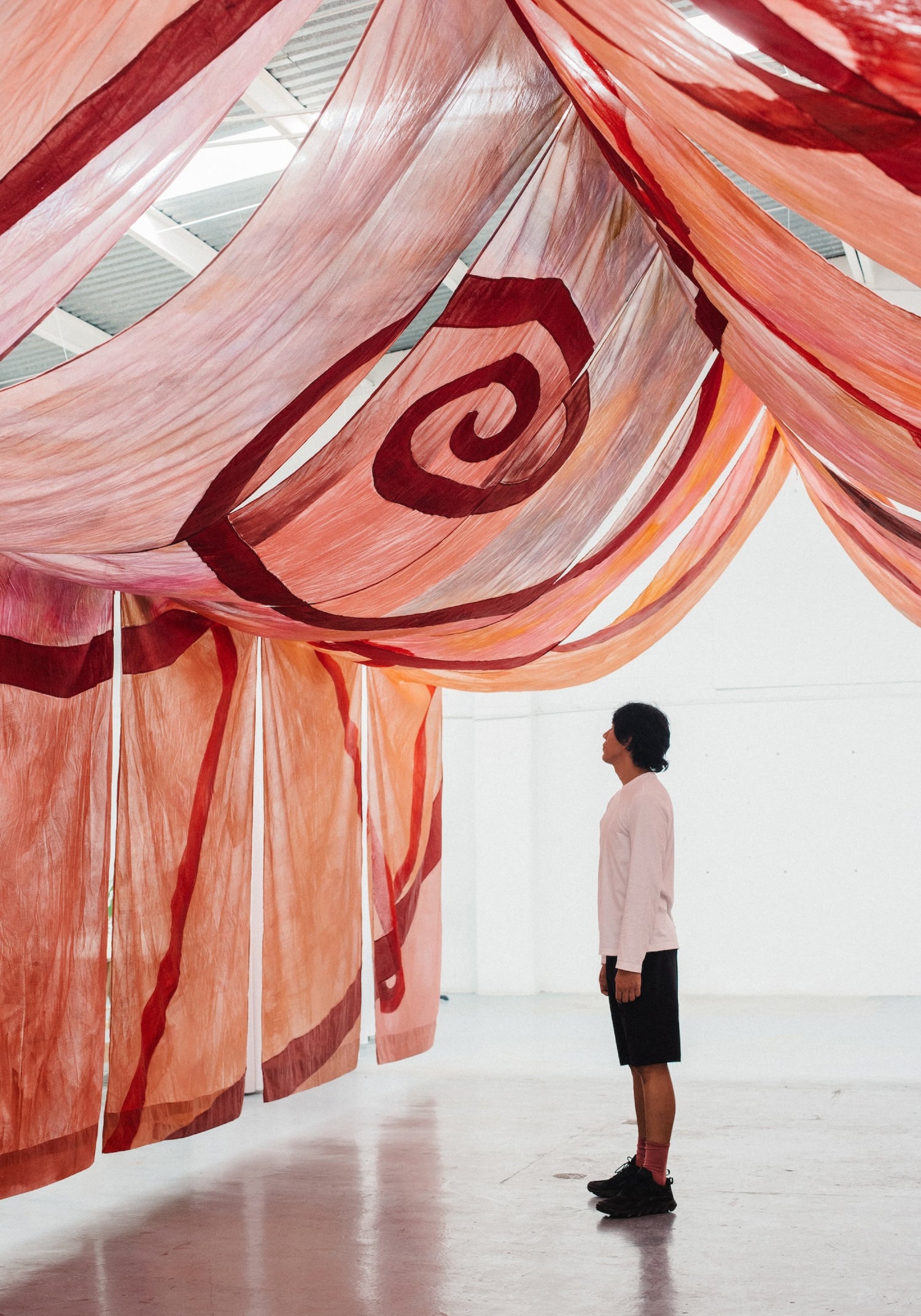 Celeste will present Melons Covered in Willow Leaves, a new immersive installation, specifically created for the studio space at Dora House. A dynamic spiral moves throughout the composition, circling, enveloping, and dividing the space, to symbolise the non-linear passage of time and to mark Celeste’s four years of evolution into a duo. The installation also suggests a shelter and a space of containment.