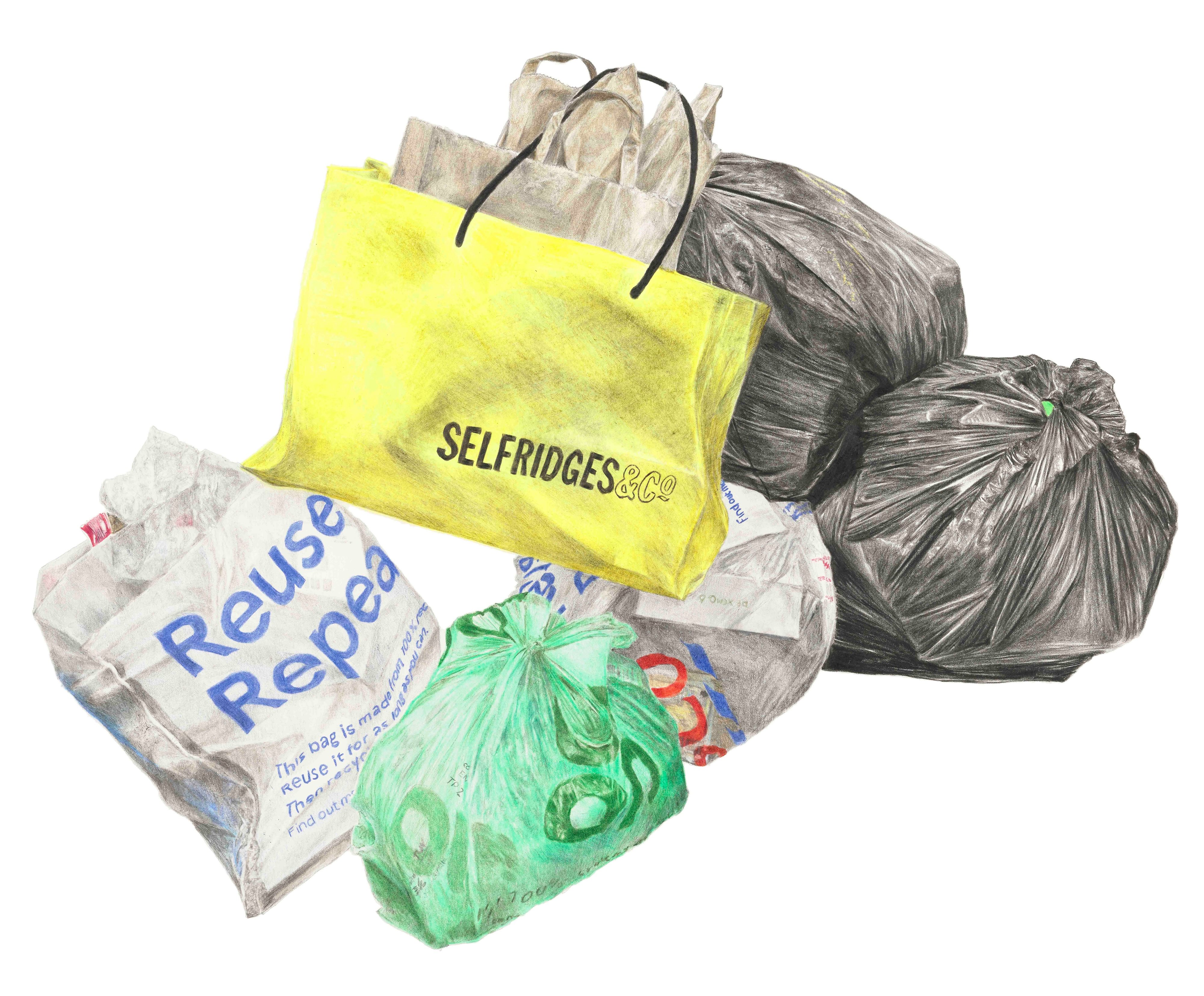 Freya Gabie works across drawing, sculpture and installation to create artworks which explore our exchange with the environment that surround us. In her series of unique drawings titled Monuments, the artist documents the piles of rubbish that collect near her home in central London. These works are a reflection on rubbish as the exhalation of society. There is an unexpected beauty to these intricately detailed artworks, which are characterised by a saturated colour palette and resplendent forms.