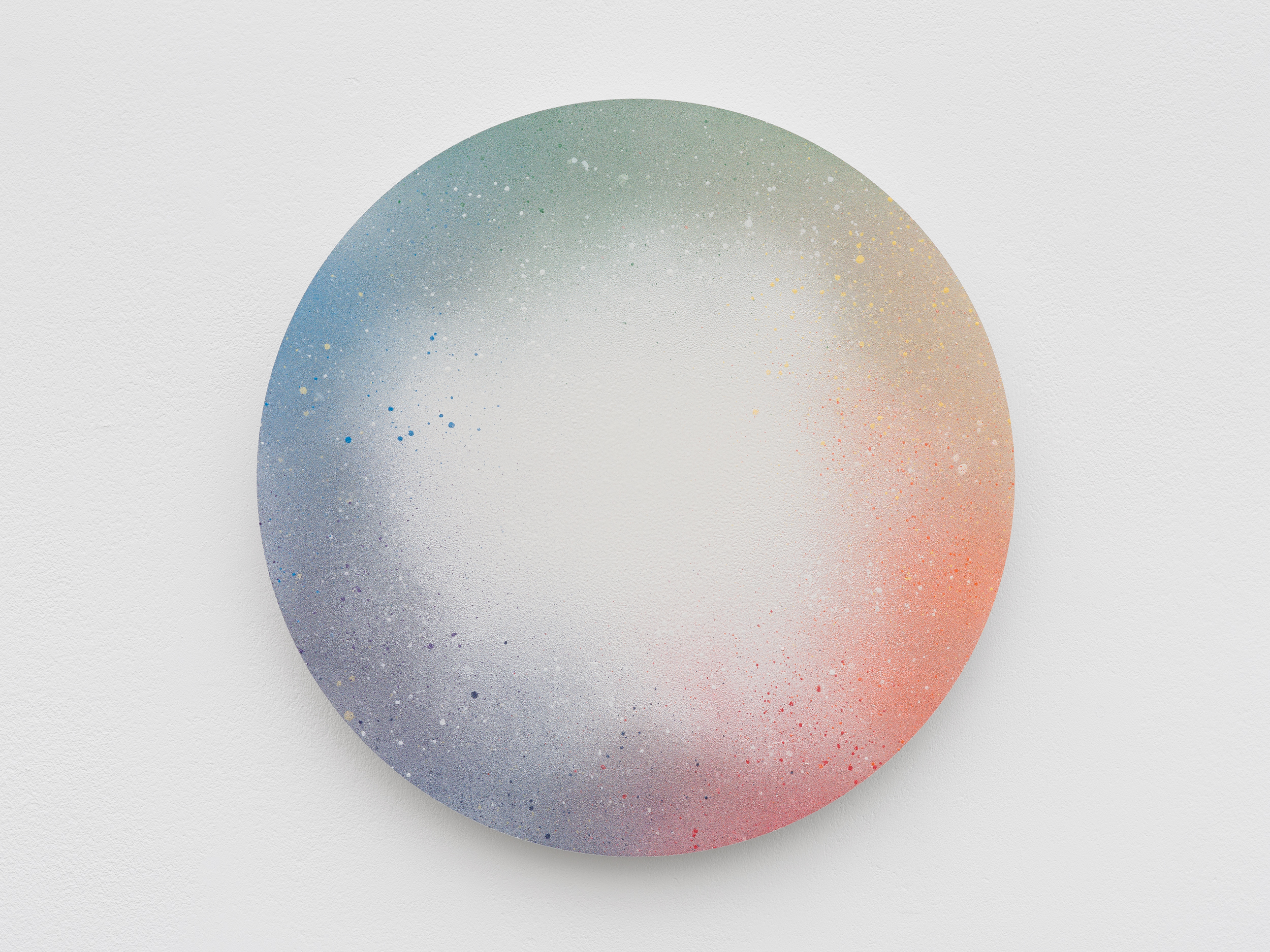 Over the past twenty-five years, Ian Whittlesea’s work has assumed many forms, from paintings and light installations to printed books and ephemera, always exploring the relationships between language, light and image. Among his latest and ongoing body of works, the White Cloud Forming paintings are made using only sprayed pigment, without brushes or any physical contact with the support. They are simultaneously a representation of another’s mystical state and entirely abstract records of the process of their own making. They have an ethereal presence that speaks of both their esoteric subject matter and their means of production. The veils of spectral colour along with the air-propelled method of application parallel Whittlesea’s ongoing work with breath and breath control.