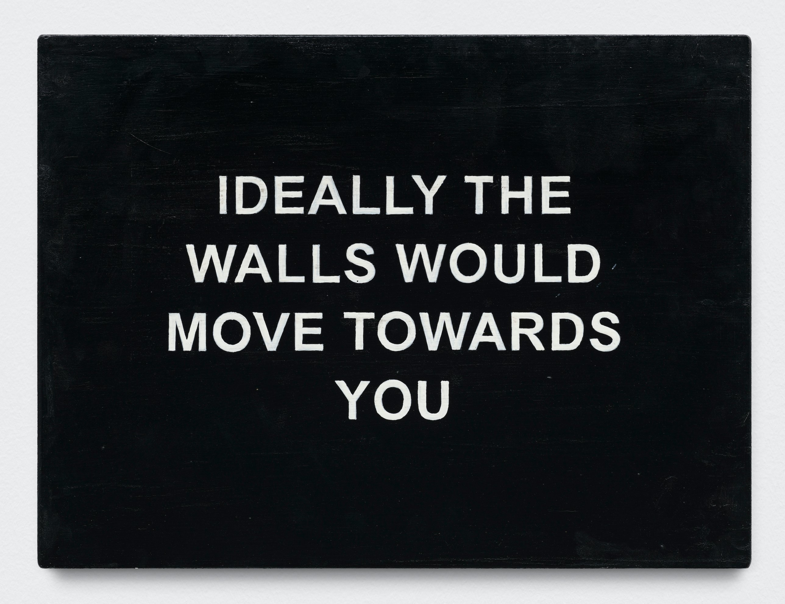 Laure Prouvost’s work challenges our perceptions of the everyday, employing a wide range of materials to explore the outer reaches of language and memory. In her immersive and sensuous assemblages, Prouvost combines films, objects and phrases to create carefully constructed environments which pull the viewer into an ideal elsewhere - somewhere in the space between fiction and reality. Her merging of imaginary personal memories with artistic and literary references creates works which are at once seductive, witty and inviting. Prouvost’s sign paintings are compelling representations of her signature narrative voice. The pieces, which each denote a different written phrase, act as playful invitations for the viewer to step into the artist's constructed reality, initiating a conversation between the artwork and the audience.