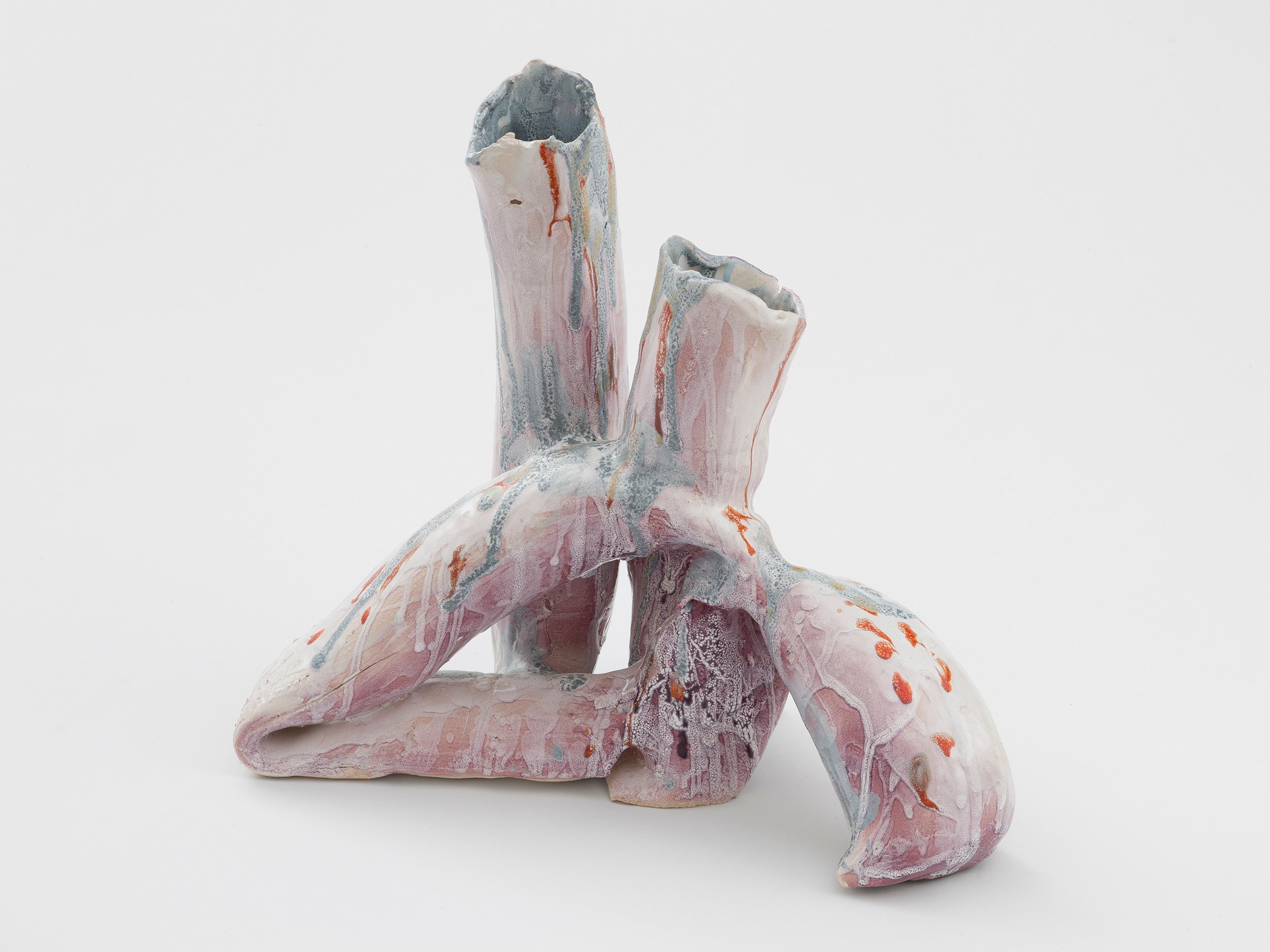 Tamara Van San experiments with the fundamental sculptural elements of volume, form and colour. Her sculptures are made of a wide variety of materials, from ceramic, plaster and wood to less conventional ones such as polystyrene, latex and synthetic gypsum. Colours often erupt spontaneously in response to the final shapes and textures, creating powerful pieces which retain their unique visual language. Van San’s approach towards sculpture has often been described as ‘anti-classical’, for her work seems to go against the absolute search towards unity and purity. Instead, it allows for a more intuitive and intimate process to take over, often leading to unforeseen shapes that the artist moulds with her own hands. Under their seemingly bright, colourful and cheerful appearance, something disturbing is brewing, something that speaks of reality and our constant struggle against disorder.